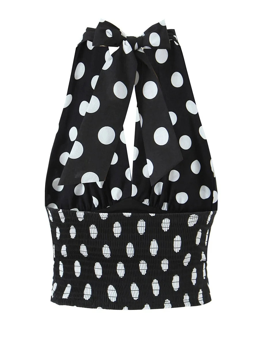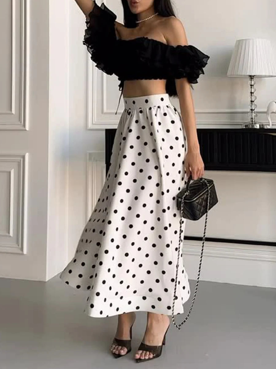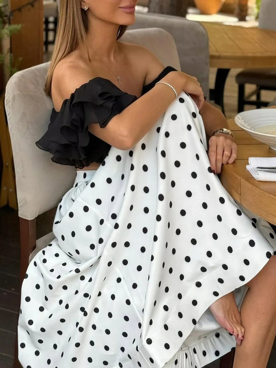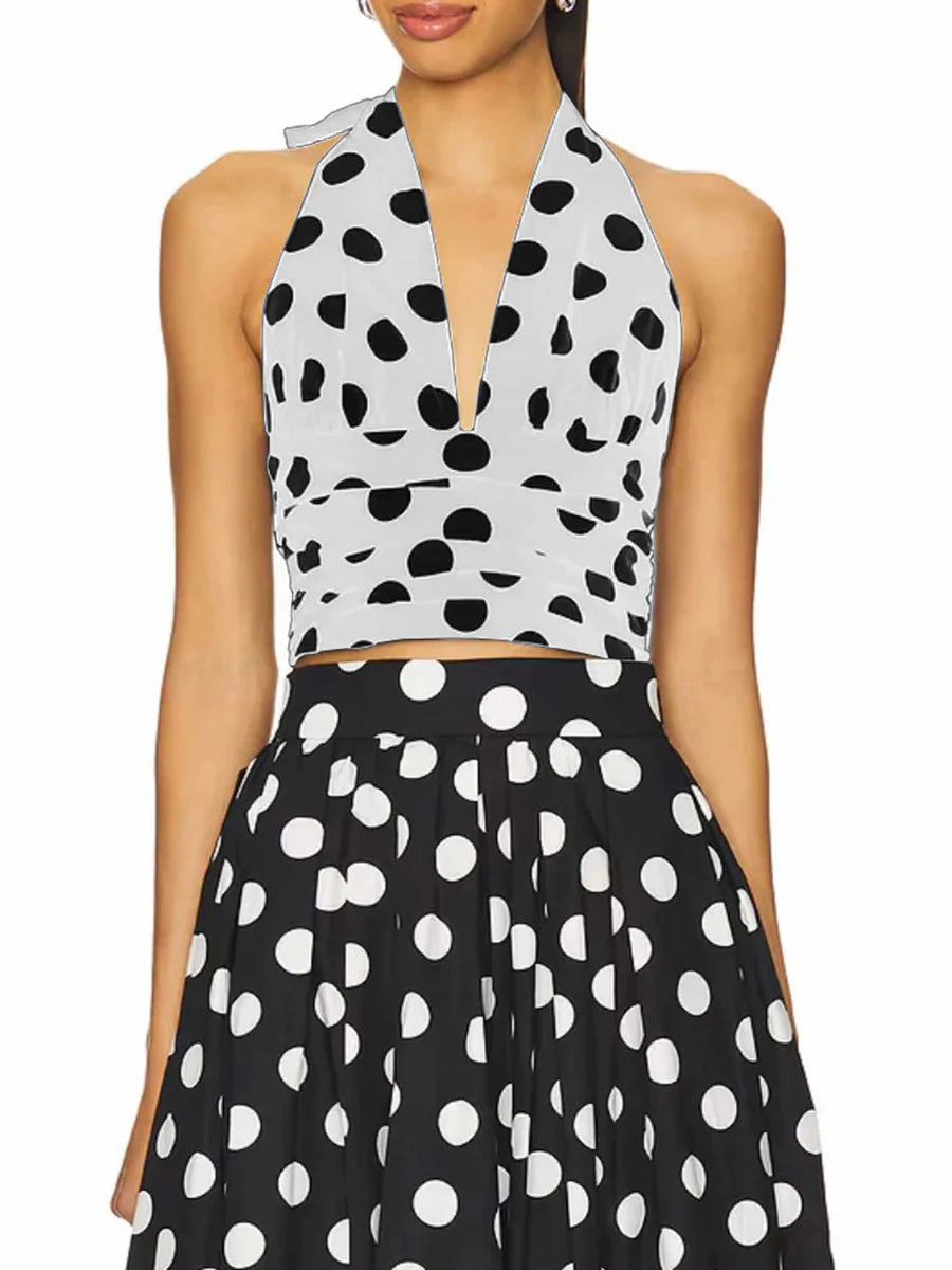 A playful yet polished two-piece set that brings vintage polka dots into a modern summer silhouette. The halter crop top features a clean V-front shape, while the high-waist A-line skirt adds movement and ease — the perfect warm-weather pairing. If you’ve ever wondered what co-ord looks effortlessly chic for a beach brunch or holiday getaway? — this one delivers instantly.
