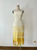 Mannequin wearing a dress with a white top and yellow fringe bottom against a plain wall.