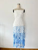 Dress with white top and blue gradient bottom on a mannequin against a white background