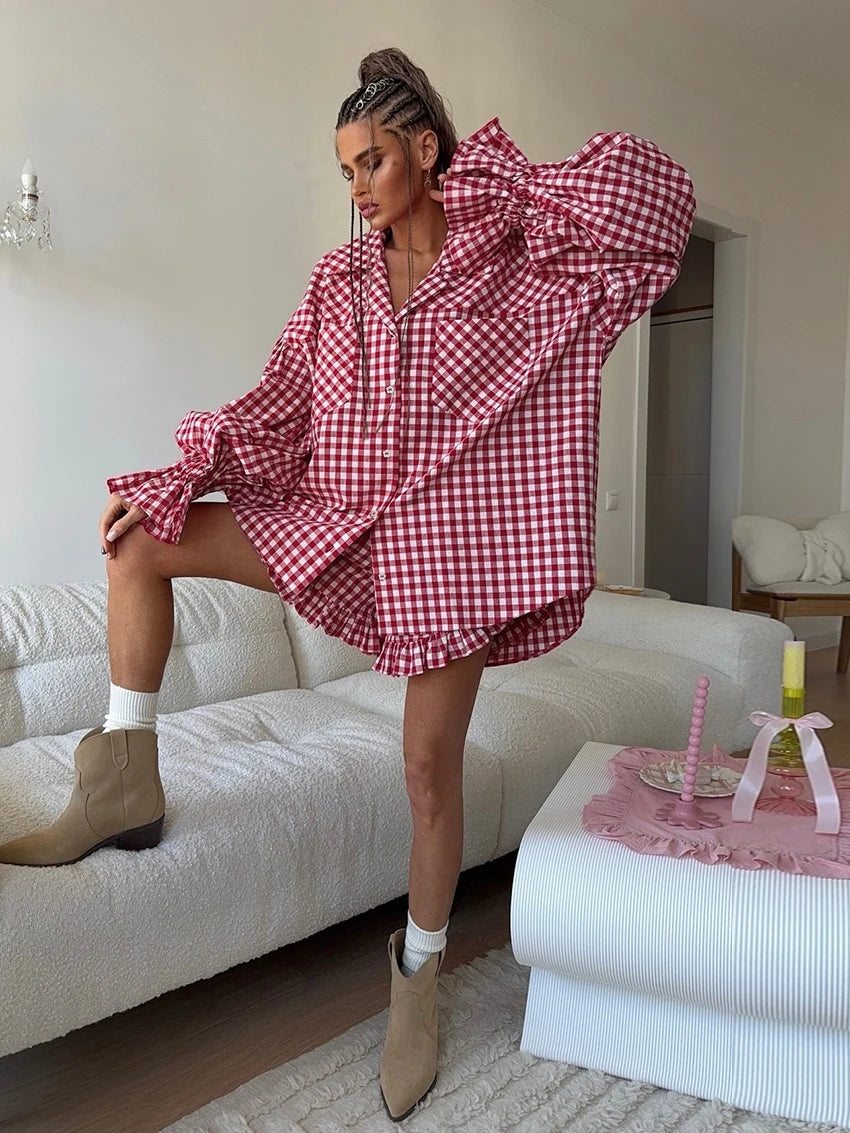 Relax in effortless style with this red plaid pajama set — a modern sleepwear essential designed for comfort without compromising on charm. Featuring a classic turn-down collar, long-sleeve top, and breathable cotton-blend shorts, this matching set blends cozy with cute for everyday lounging or weekend unwinding.