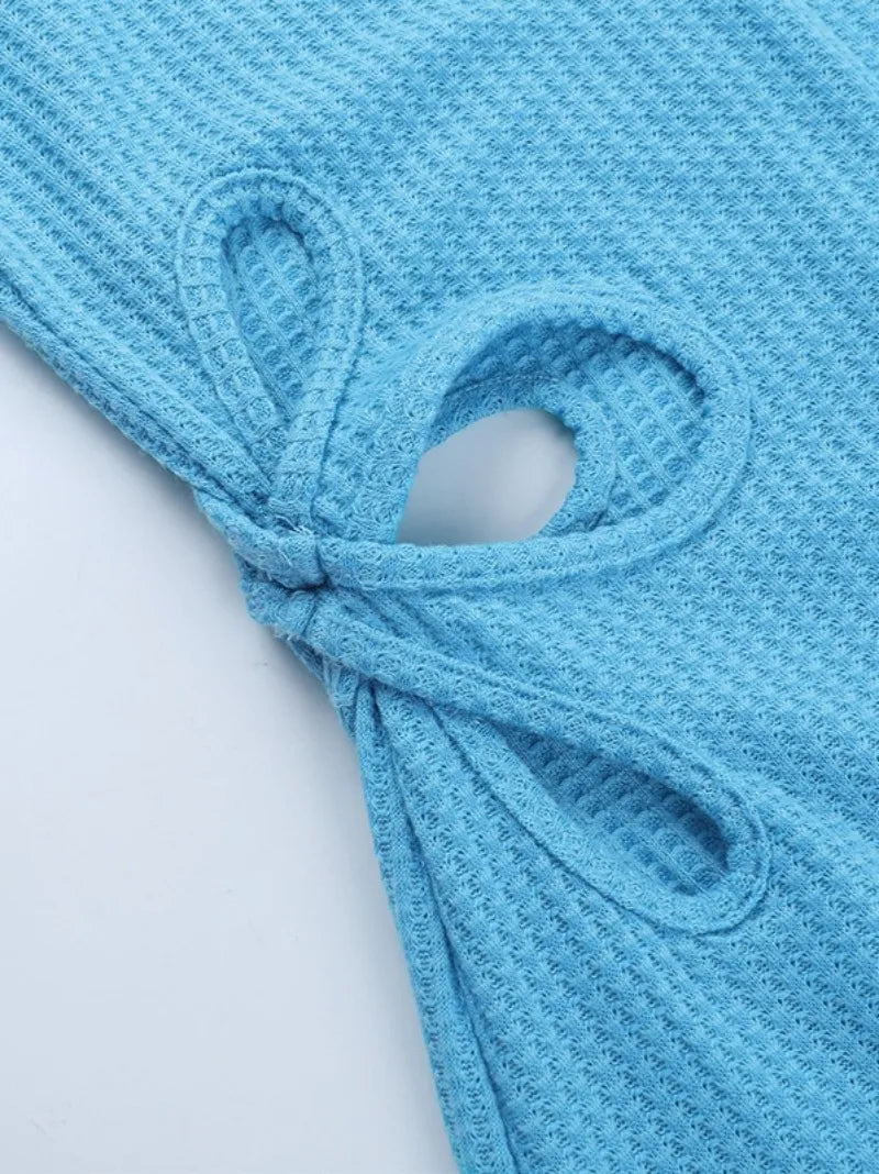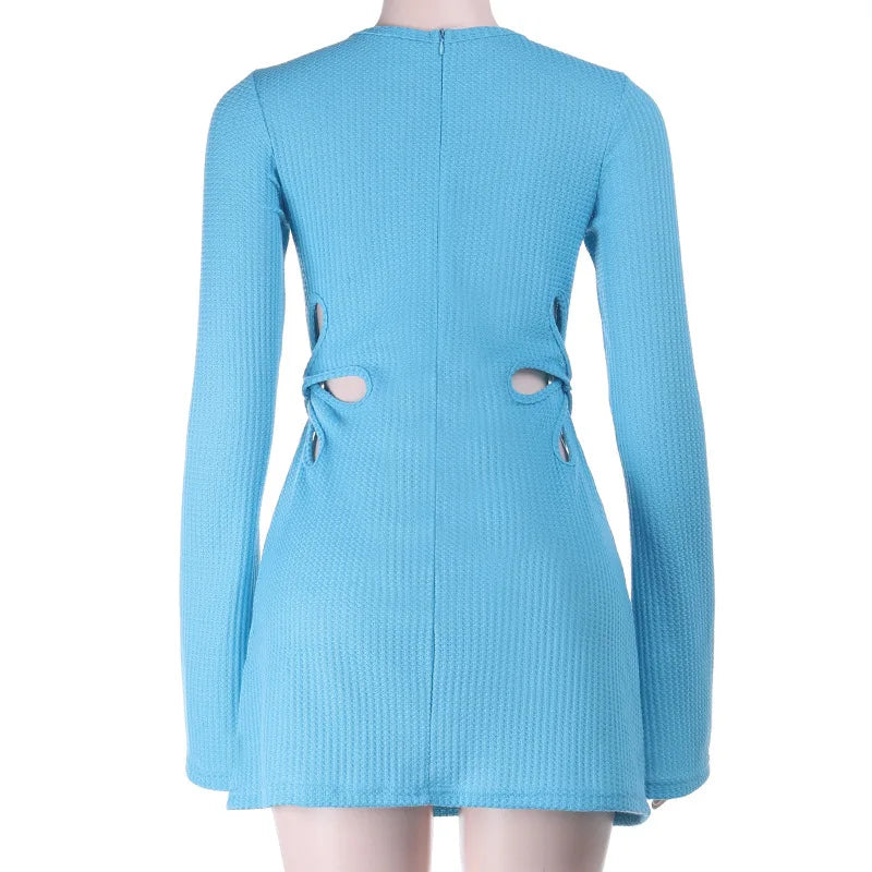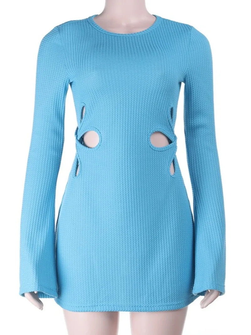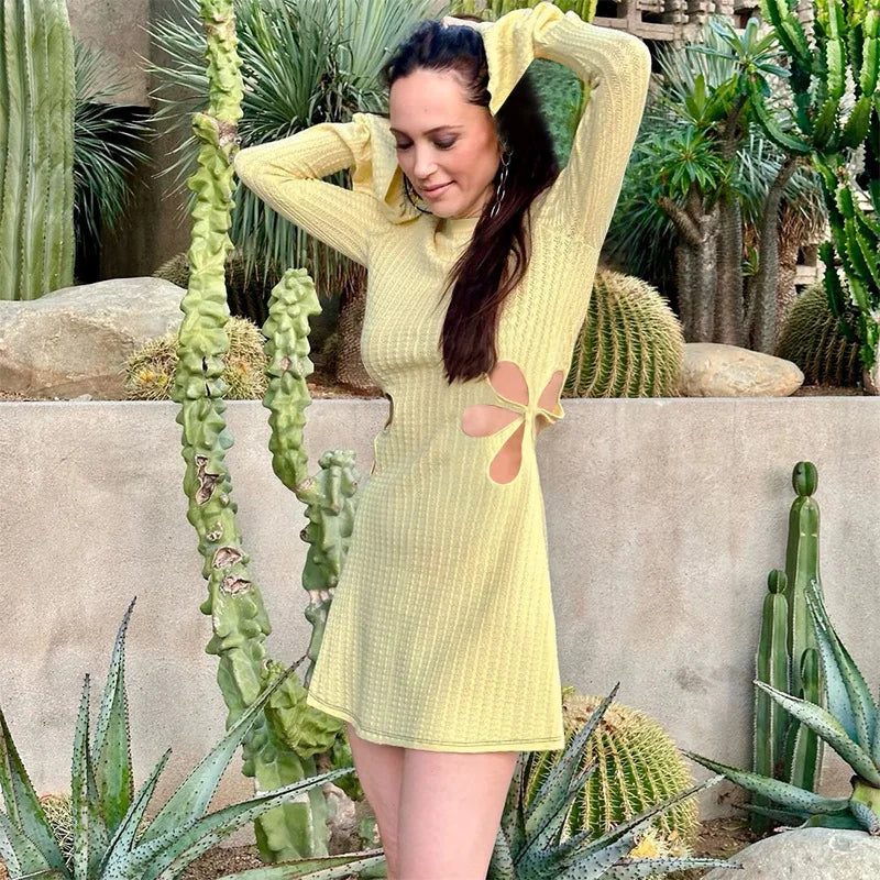 A modern study in shape and simplicity. This ribbed mini dress plays with light and form — the petal-shaped cutouts at the waist add a quiet drama that feels both architectural and feminine. The silhouette moves easily, close to the body yet never restrictive. This is the piece I reach for when I want to feel composed, with just the right hint of edge.
