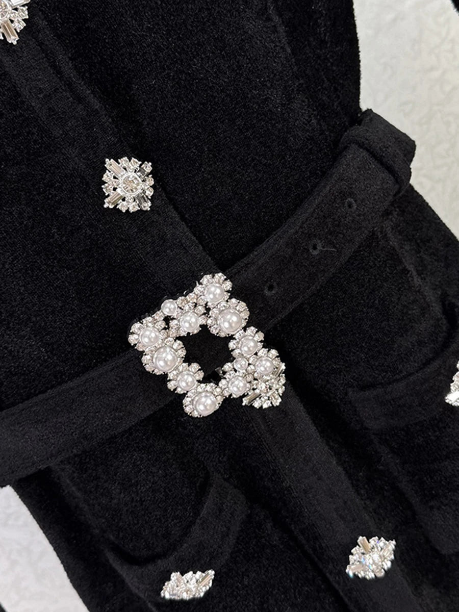 A tailored mini silhouette enriched with diamond-like buttons, soft lace-trim cuffs, and a sculpted round neckline that frames the upper body with quiet elegance. The dress feels like a finely carved evening sculpture — structured, balanced, and unmistakably refined. I reach for pieces like this when I want something polished without looking overdone, especially on days when I ask myself what elegant mini dress works for special dinners or formal gatherings.