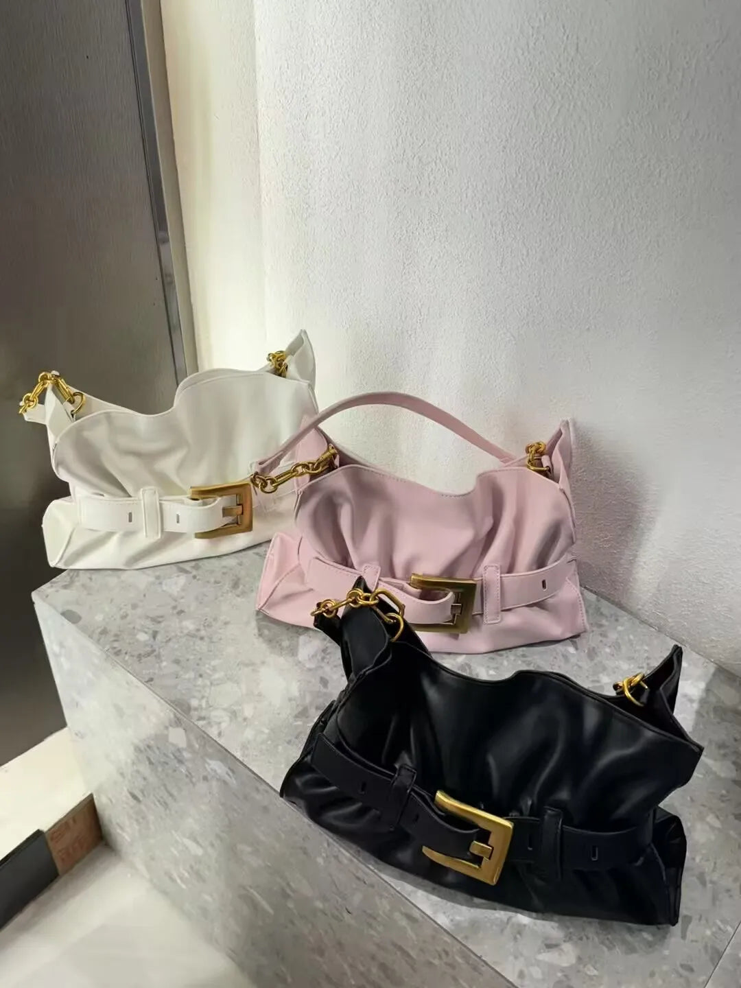 A soft, sculpted statement piece for the modern wardrobe. This ruched microfiber synthetic leather baguette bag blends effortless femininity with structured elegance. The signature gold buckle detail adds a touch of glamour, while its compact, soft-body silhouette fits all the essentials for both day and night. Available in three timeless colours — black, ivory, and blush pink — this piece complements any outfit, from casual brunch to evening events.