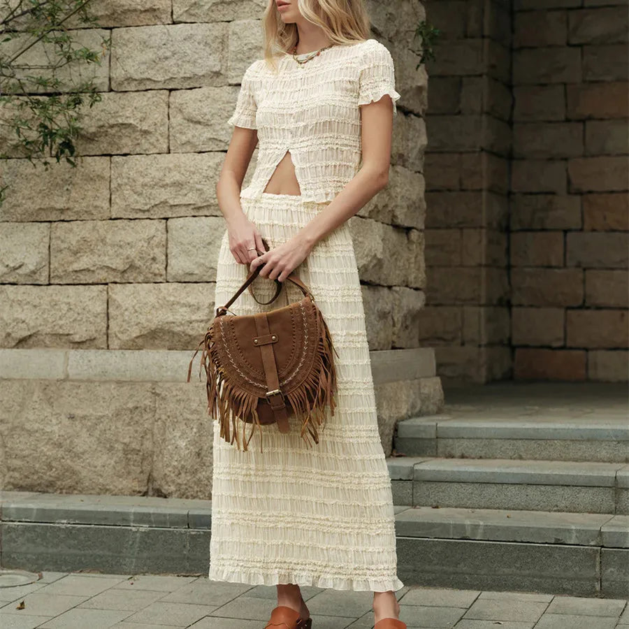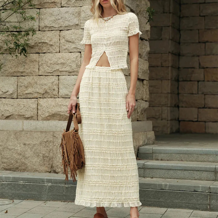 Elevate your summer wardrobe with this effortlessly chic two-piece set — featuring a delicately ruched ankle-length skirt and a coordinating cropped top with button-up detailing. Crafted for warm-weather elegance, this set moves beautifully with you, perfect for beachside dinners, garden brunches, or slow strolls through charming city streets.
