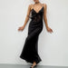 This satin maxi dress glides like a quiet melody — smooth, effortless, and meant to be felt more than seen. The lace-trimmed bodice catches light softly, framing the neckline in delicate contrast, while the fluid drape elongates the silhouette with quiet grace. This is the piece I reach for when I want to feel composed yet undone, like the calm at the center of an evening.