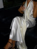 Style it with sculptural jewelry and strappy heels for a refined evening edit, or pair with minimalist accessories for a sleek gallery-night mood. The satin’s fluid reflection gives it an almost sculptural grace — like moonlight translated into fabric.