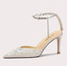 Radiate timeless elegance with our Satin Rhinestone Chain Sandals. Featuring a sleek pointed toe, delicate ankle strap, and shimmering crystal chain detail, these heels are designed for weddings, banquets, and special summer occasions.