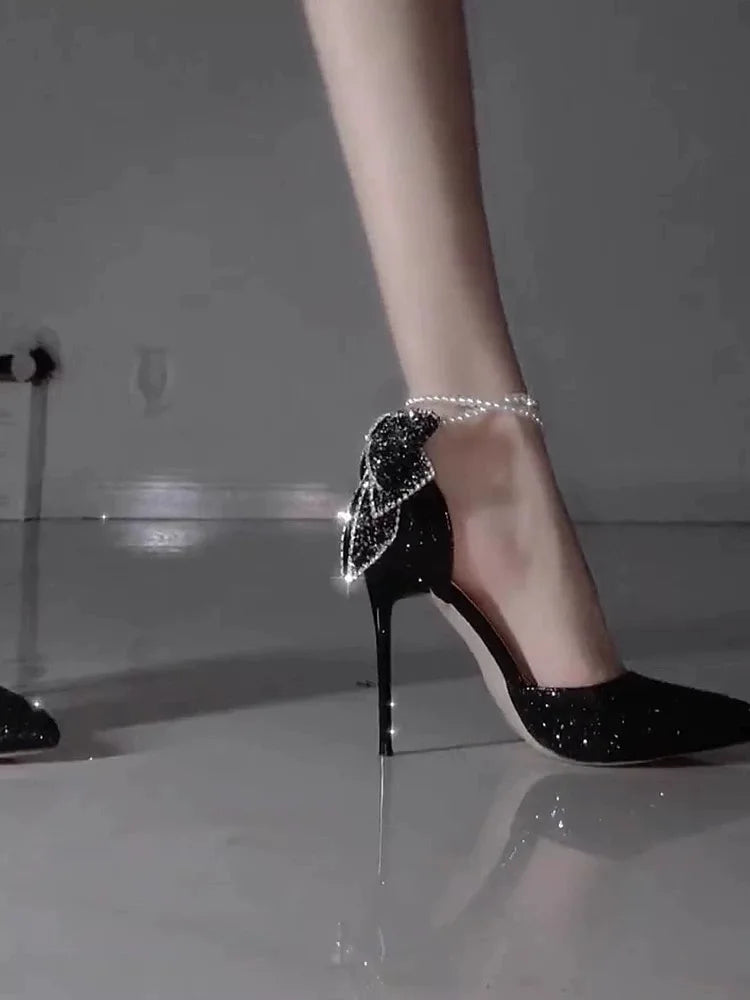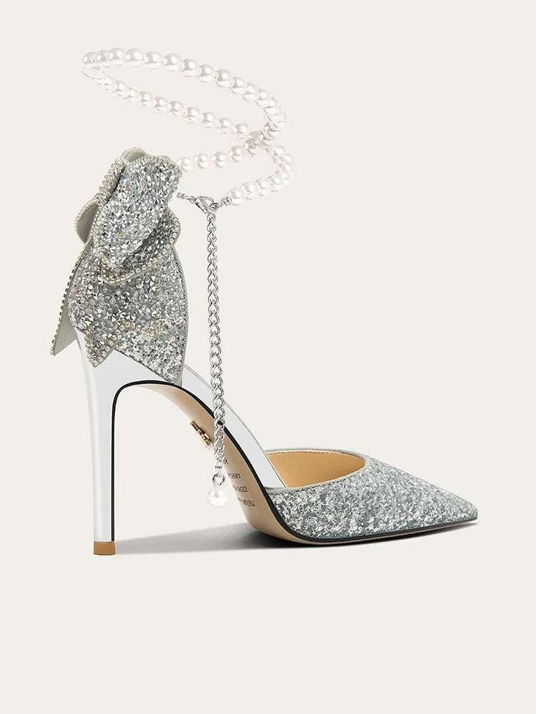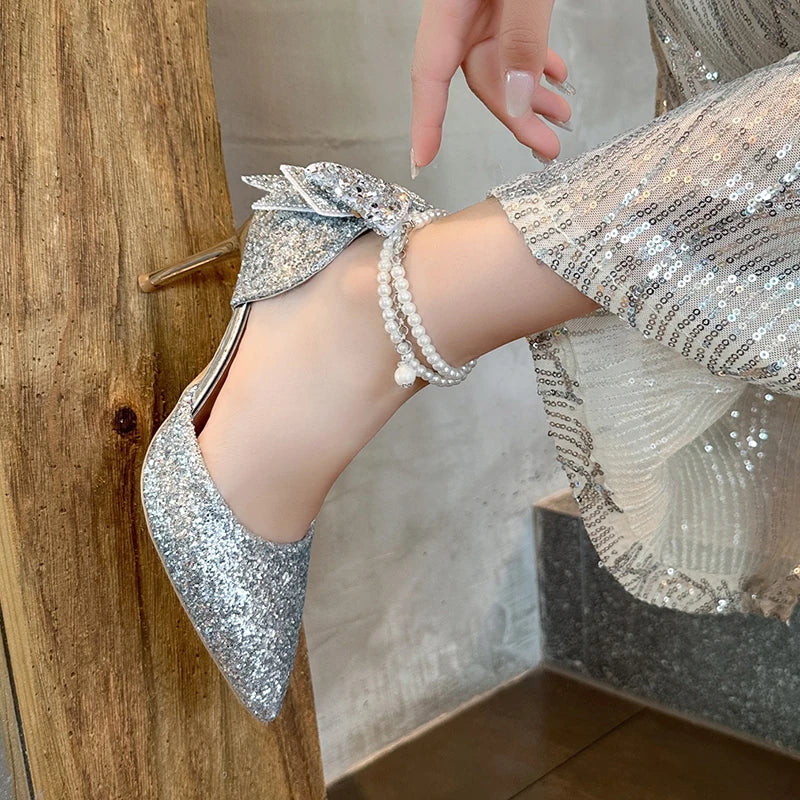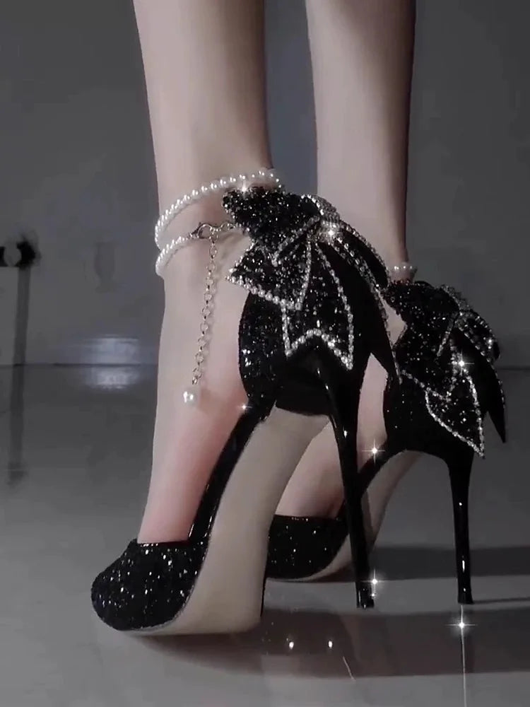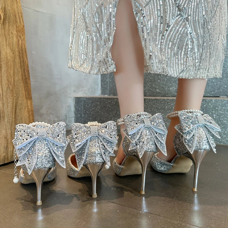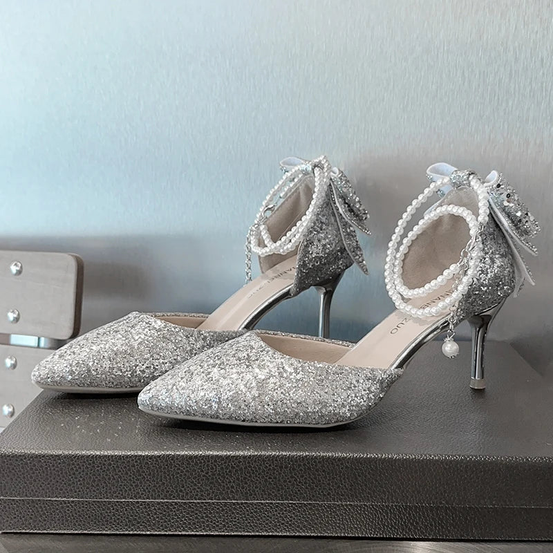 Refined elegance meets Parisian charm in these handcrafted sequin bow heels. Designed with a shallow cut, pearl-lined edge, and fine pointed toe, these high-heeled pumps exude femininity and modern sophistication. Perfect for work, dinners, and upscale occasions, this shimmering pair adds graceful allure to every step.