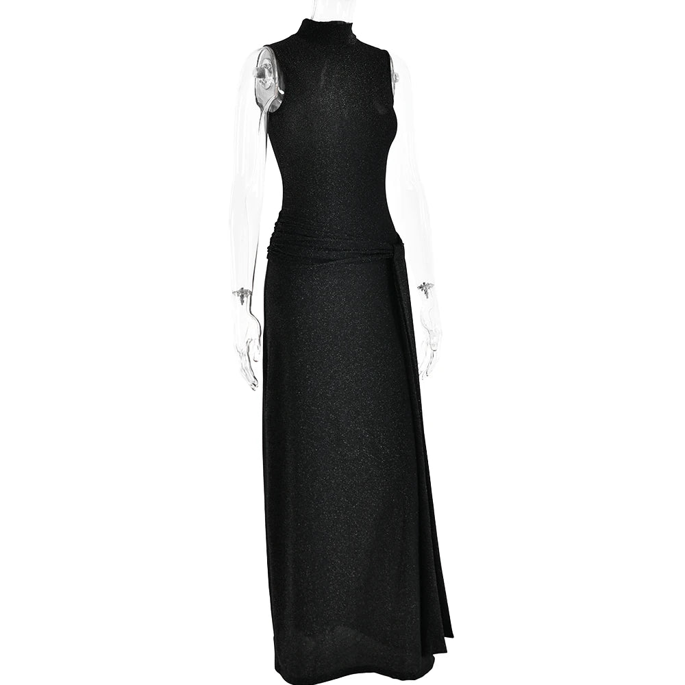 Sleek, sculpted, and quietly magnetic — this high-neck wrap maxi dress feels like evening elegance distilled. The subtle shimmer catches light in motion, while the clean sleeveless cut balances modernity with restraint. Its ruched detailing and wrap slit contour the figure with soft precision, evoking the kind of sophistication that doesn’t need to announce itself.