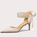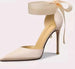 Step out in style with these elegant silk pumps, a timeless choice for any formal event or evening out. The super-high, thin heel and classic silhouette create a sleek and confident feel, while the beautiful ribbon-bow detail adds a touch of modern romance. This is the perfect shoe if you're looking for a bold, statement-making piece that combines a luxurious, feminine design with a modern, sleek look.