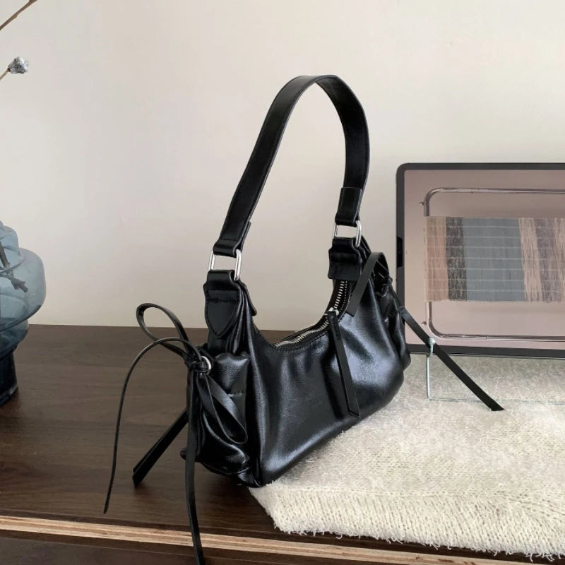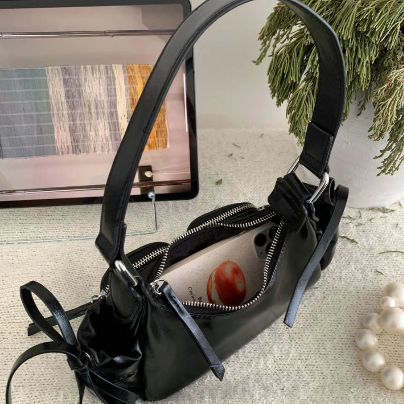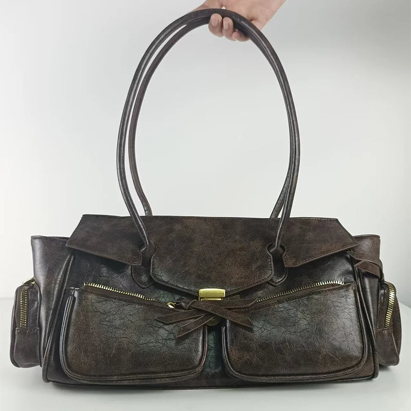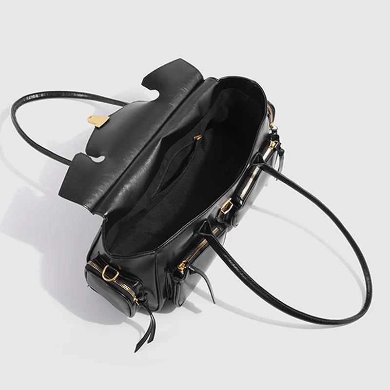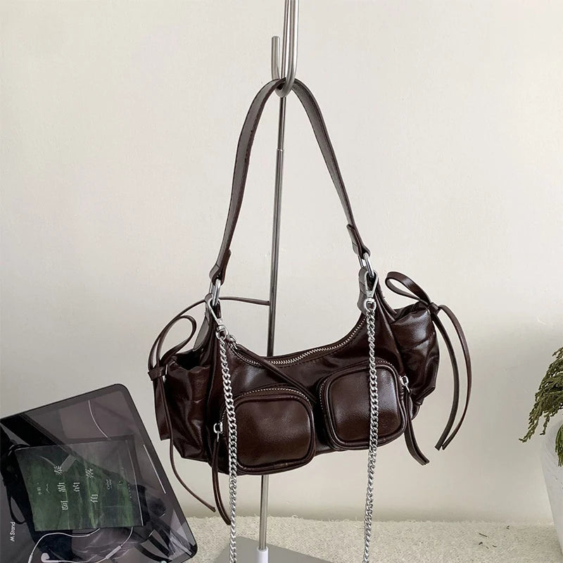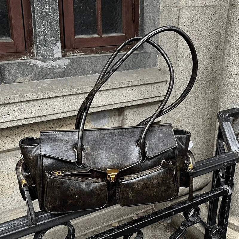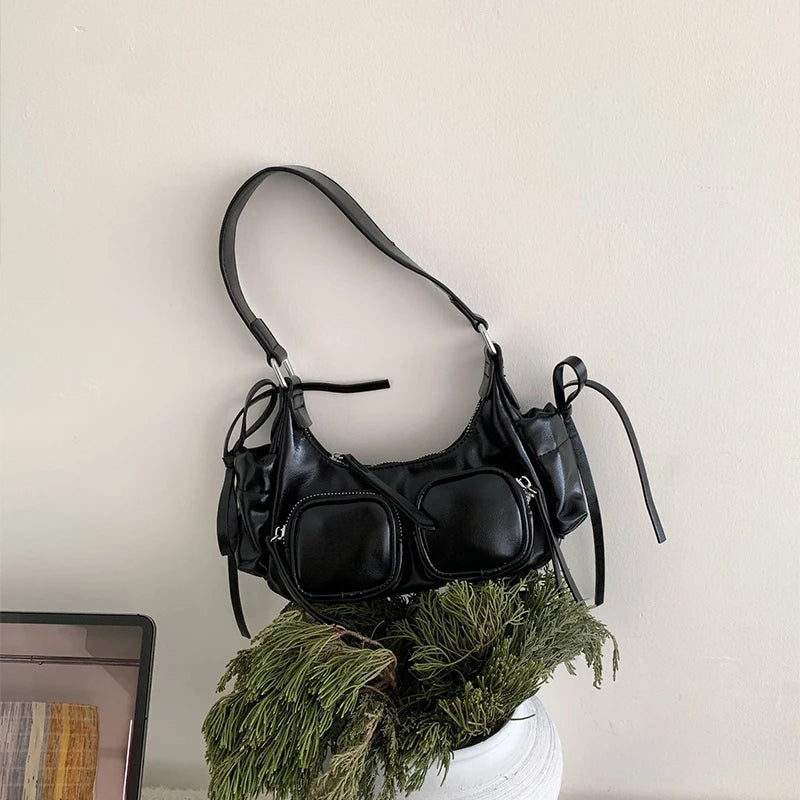 Step into the Y2K resurgence with modern edge. This Soft Split Leather Multi-Pocket Baguette Bag blends utilitarian design and effortless chic — a sleek silhouette elevated with functional pockets and languid tassel detail.
