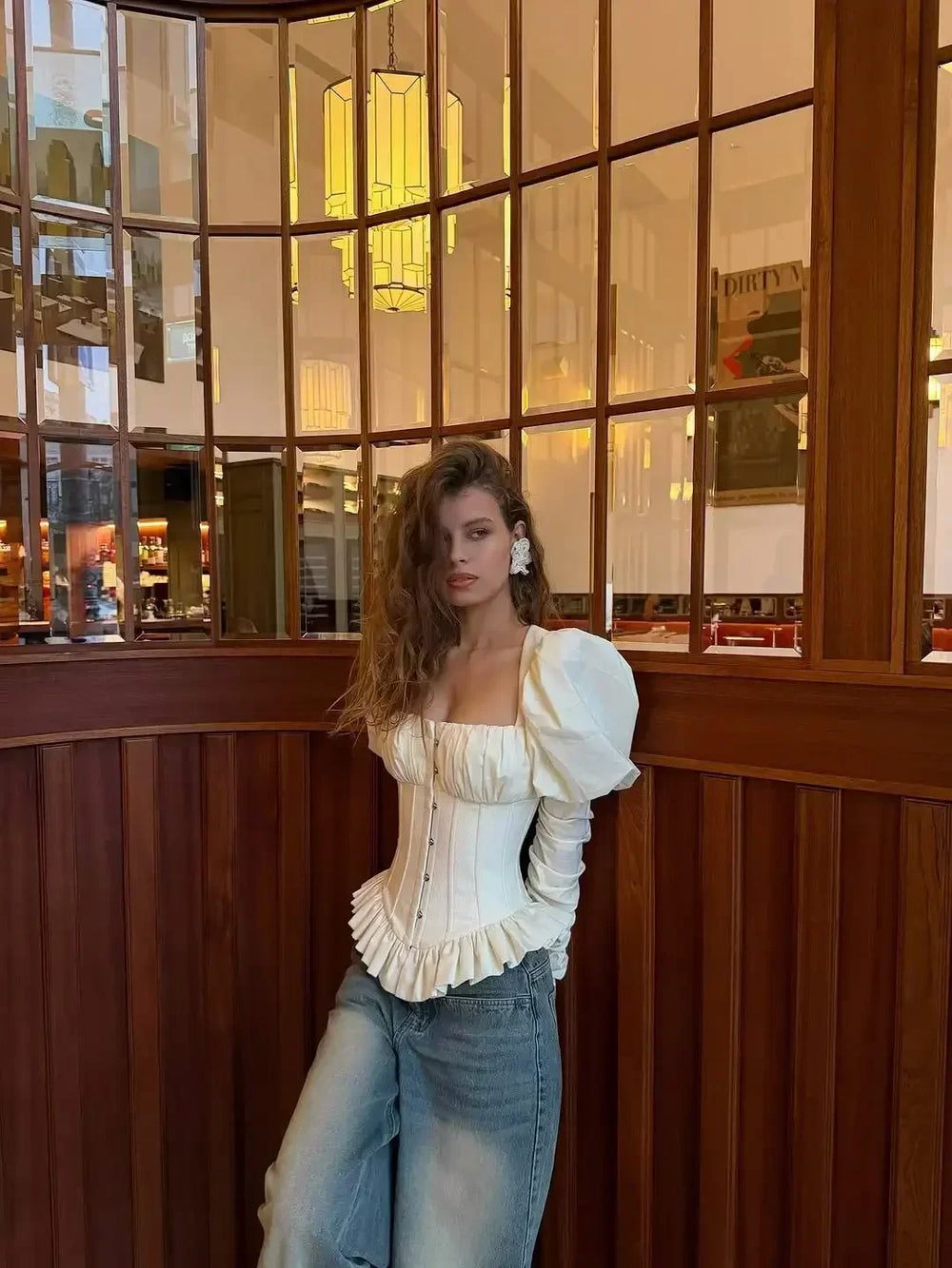 A corset-inspired blouse that balances soft romance with sharp structure. The square neckline frames the collarbone, the puff sleeves add volume, and the sculpted bodice creates a defined waist that instantly elevates denim, tailoring, or evening trousers. “what top makes jeans look dressed up” is exactly what this piece does (as photographed in an ivory tone with a ruffled peplum hem).