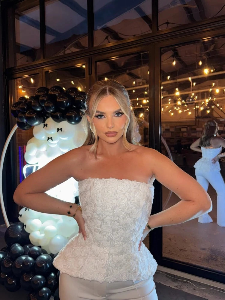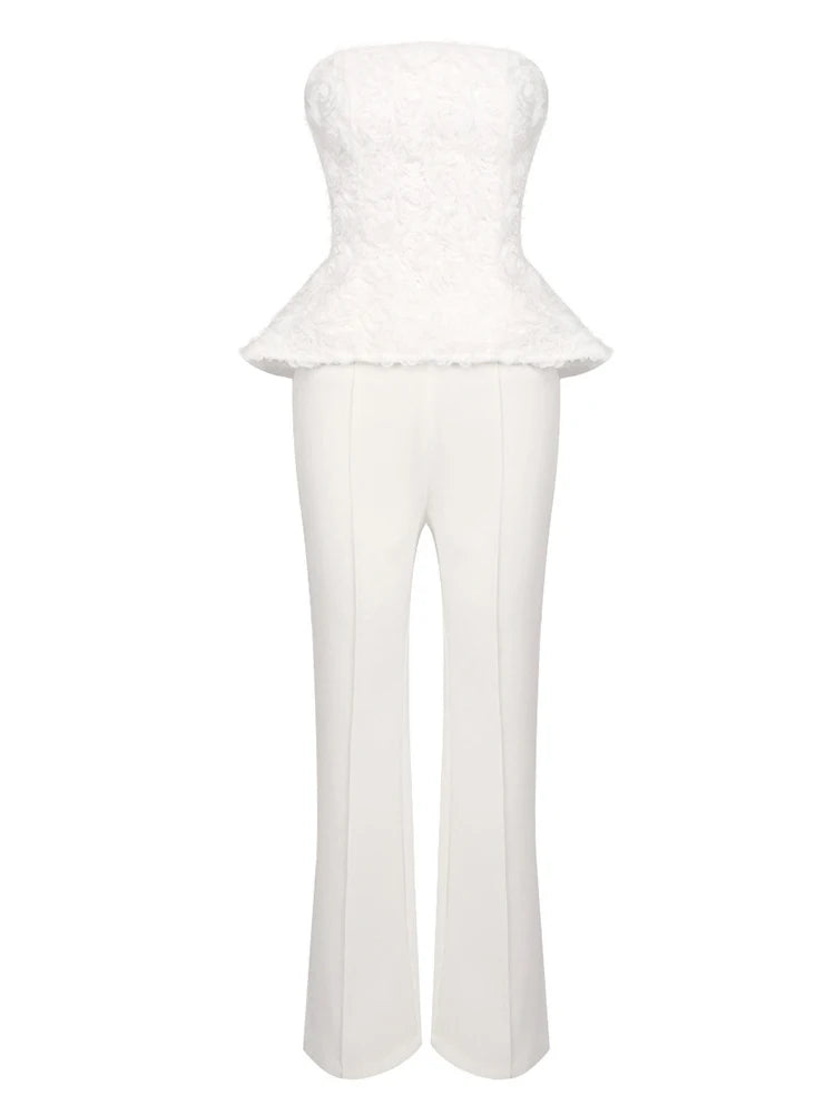 Elegance comes without trying. This strapless two-piece set feels effortlessly sculpted — the structured bodice adorned with delicate 3D floral appliqués adds quiet dimension, while the wide-leg pants elongate the frame with draped, tailored ease. It's the kind of look that holds presence without needing sparkle; more architected than decorated, yet softly romantic. This is the piece I reach for when I want refined drama without the noise.