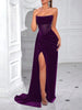 Crafted from a woven synthetic blend with structured boning. Handle with care; steam lightly to maintain smoothness. Store hanging to protect the slit and neckline shape.