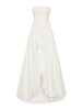 Make a statement in this head-turning black and white strapless gown, tailored for evenings that demand bold elegance. The dress pairs a sculpted ruched white bodice with a voluminous black floor-length puff skirt, finished with a dramatic thigh-high slit for just the right amount of edge.