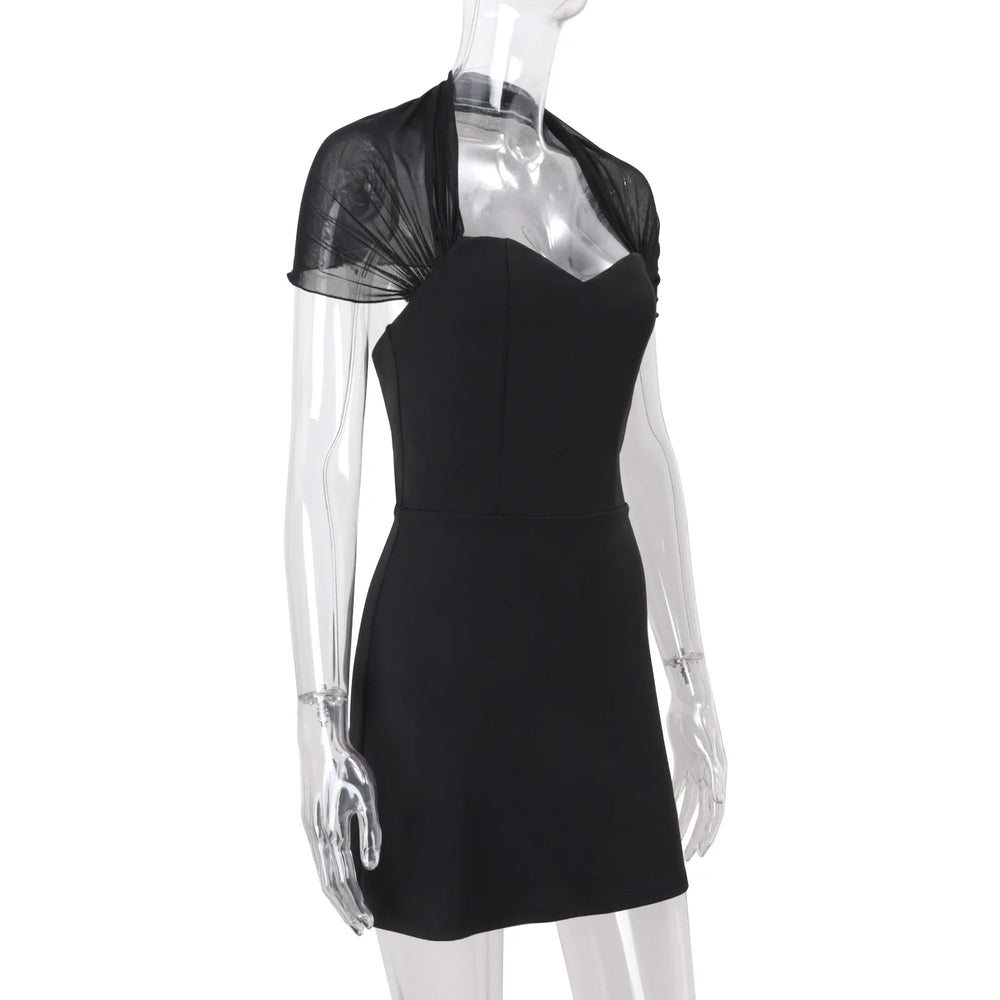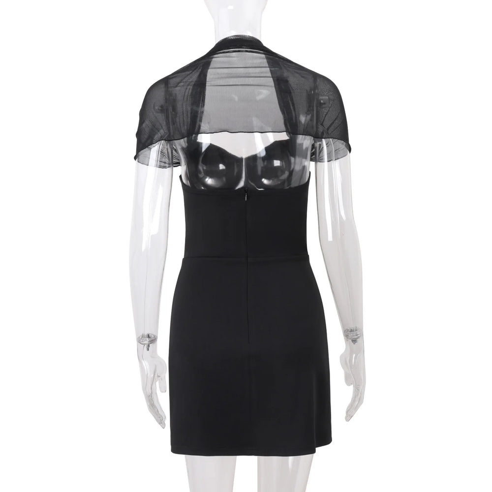 A sleek mini with a sweetheart neckline and a built-in sheer mesh bolero that frames the shoulders for an effortlessly polished finish. The slim, stretch-forward fit hugs cleanly without feeling restrictive, making it a go-to for nights when you want minimal styling with maximum impact. If you’re wondering “what mini dress should I wear for a night out,” this is the answer.