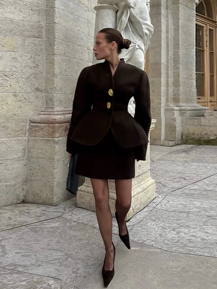 Wear it as a full look with pointed heels and a compact bag for events, dinners, or elevated work settings. You can also split the set: style the jacket over denim for a chic everyday layer, or pair the skirt with a fine knit for a clean, minimal outfit. In the photographed look, the set appears in a deep chocolate-brown tone that looks especially rich against stone architecture.