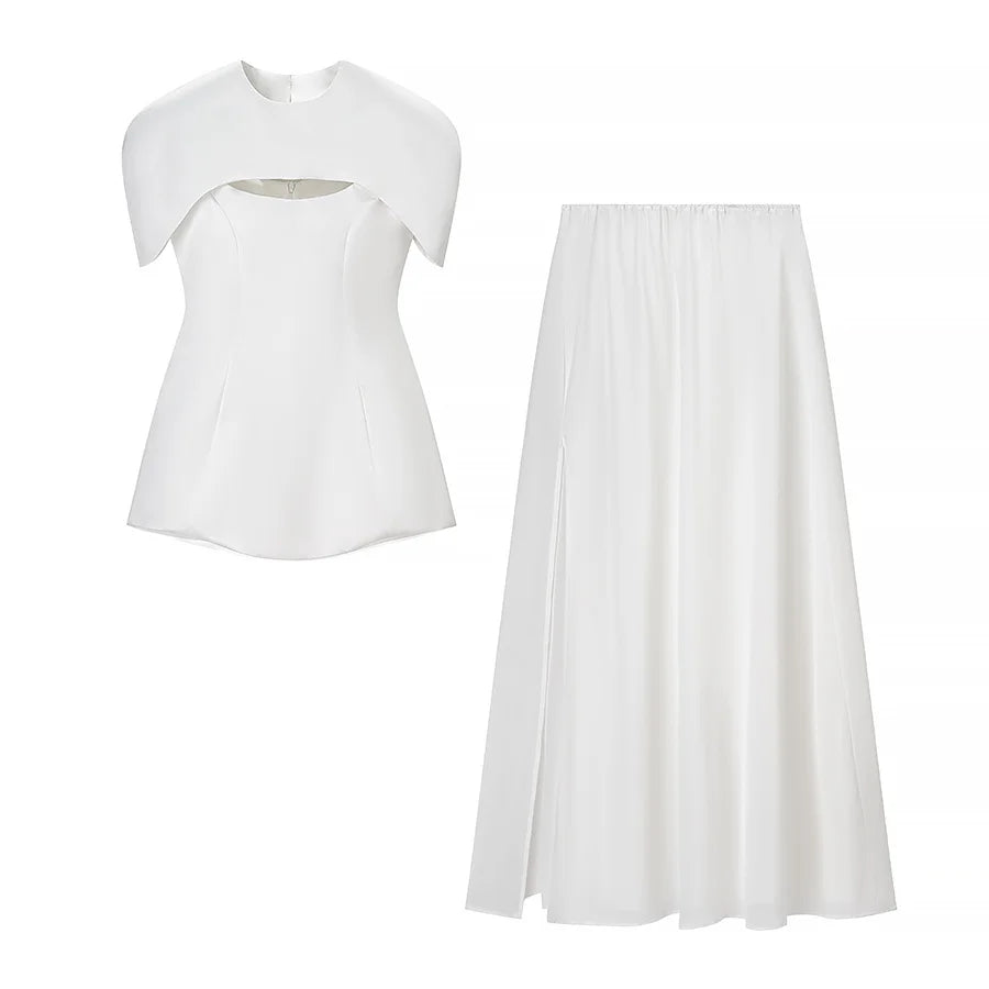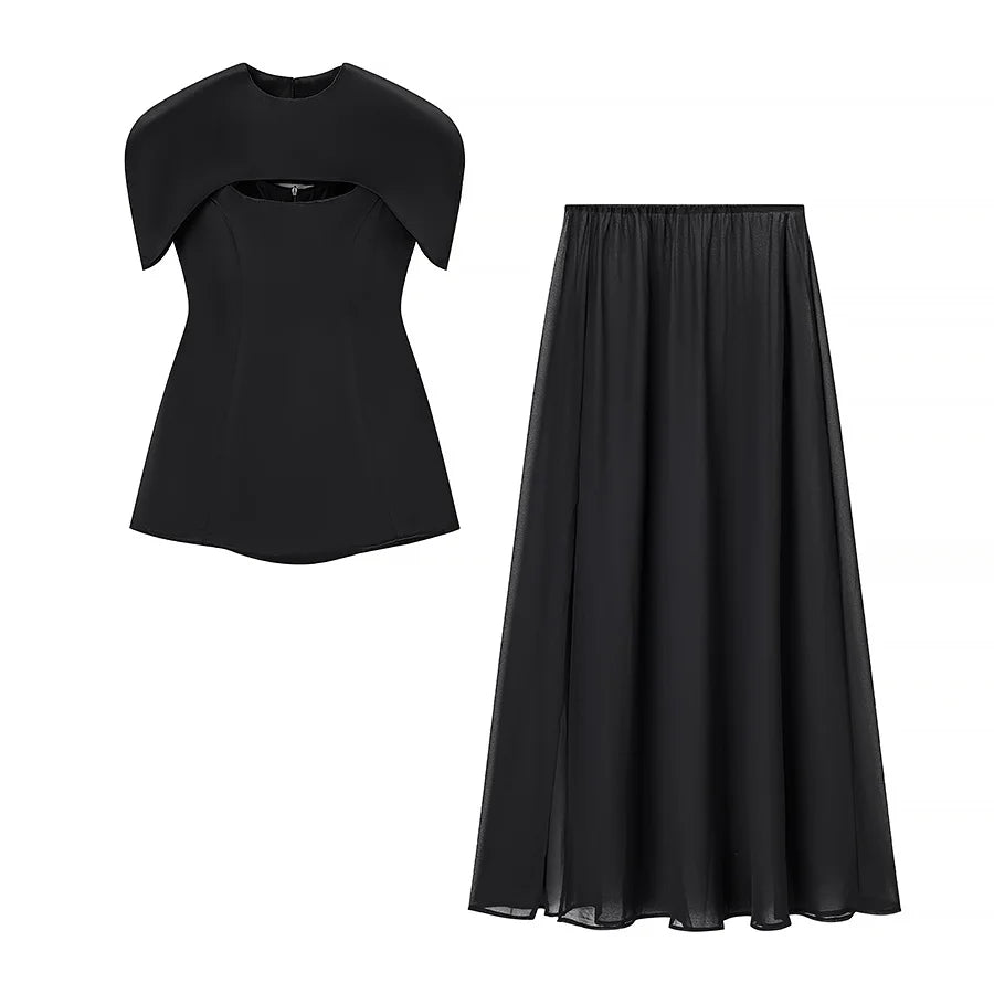 Architectural grace meets modern femininity in this three-piece ensemble — a structured sleeveless top, sculptural shawl, and flowing mesh skirt that together redefine contemporary elegance. Every line feels deliberate; every layer adds depth. It’s a silhouette that commands space without noise. This is the set I reach for when I want to feel composed, elevated, and entirely myself.