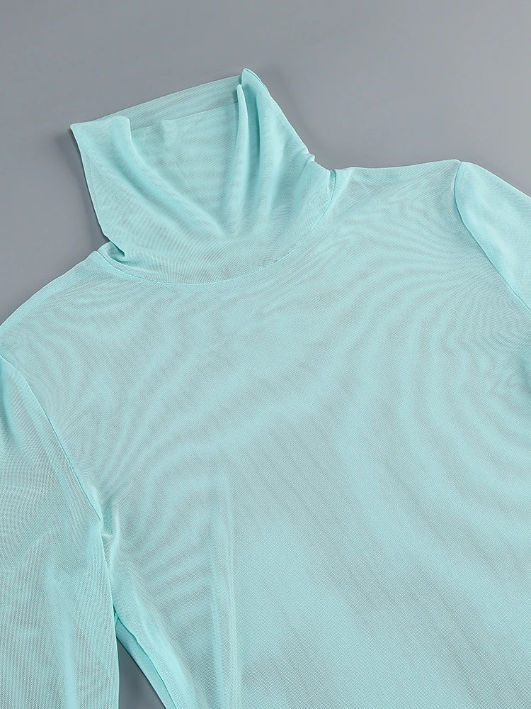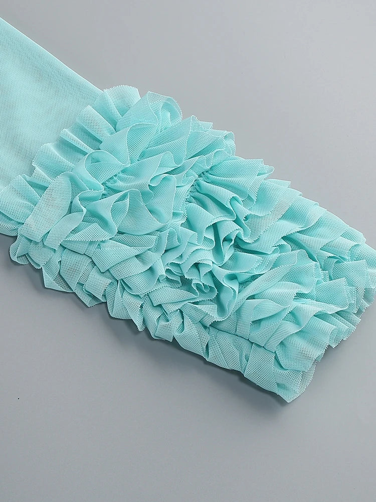 Make a sophisticated statement in this Turtleneck Ruffle-Cuff Mesh Patchwork Midi Dress. Designed for the adult female, this elegant long dress features a chic turtleneck neckline and long sleeves with delicate ruffle-cuffs. The patchwork design, incorporating sheer mesh panels and subtle ruffles, creates a modern and alluring look. Crafted from polyester with slight stretch, this mid-calf length Dress offers a bodycon slim fit and a sleek sheath silhouette, enhancing your figure. With an empire waist and a zipper closure, it's perfect for evening parties, cocktail events, and club nights in All Seasons.