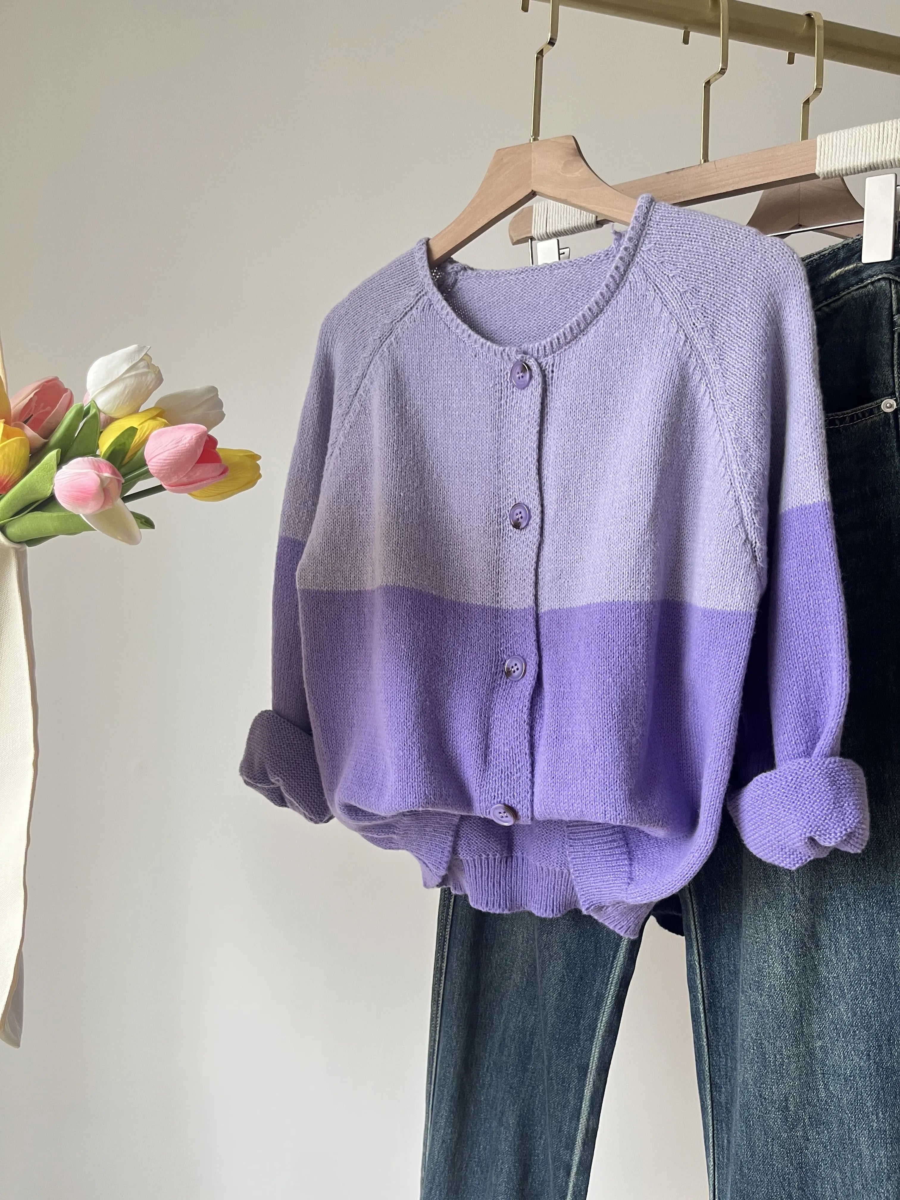 Two-Tone Knit Cardigan | Junior Purple Gray Korean Style
