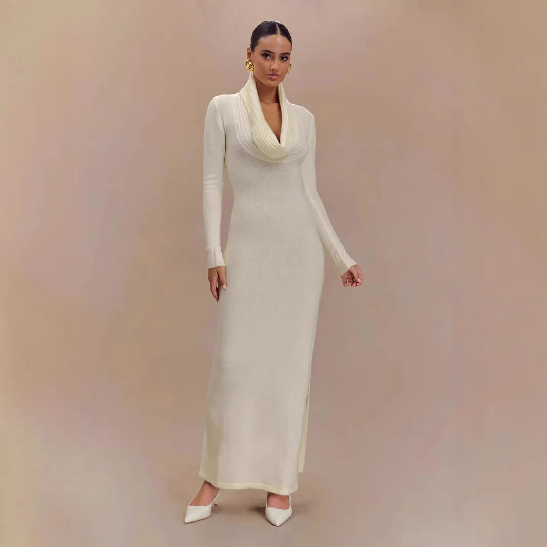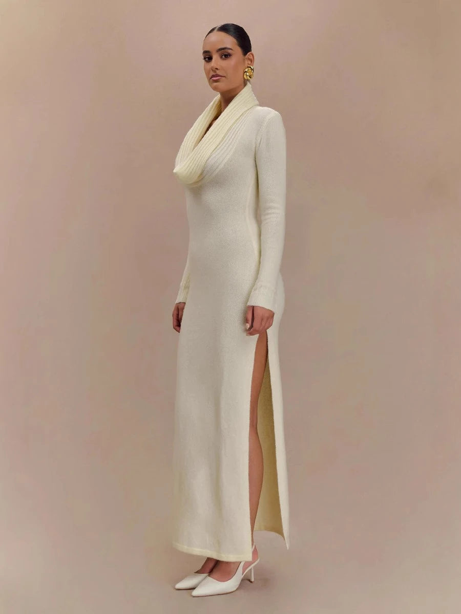 A whisper of softness, a sculpture in motion. This cowl-neck knit maxi dress drapes like poured cream, embracing the body with quiet confidence. The fluid neckline and long sleeves evoke an understated sensuality that feels both effortless and composed. This is the piece I reach for when I want to feel calm yet commanding — like elegance distilled.