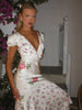 Step into effortless elegance with this white floral knit dress, perfect for turning sidewalks into your runway. Designed in a flattering trumpet silhouette with a soft V-neckline, flutter sleeves, and a swirl of romantic blooms, this mid-calf length staple celebrates the art of French-inspired dressing for summer strolls, brunches, or garden parties.