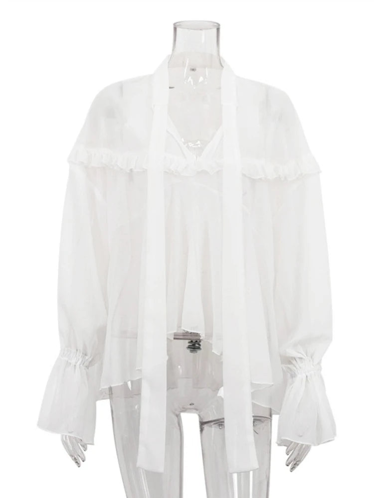 A soft, sculptural blouse designed for movement, lightness, and quiet romantic energy. This flowy V-neck silhouette drapes effortlessly, with cascading ruffle folds and airy flare sleeves that bring a dreamy, feminine finish to any outfit. The sheer-inspired look keeps it modern, poetic, and seasonless.