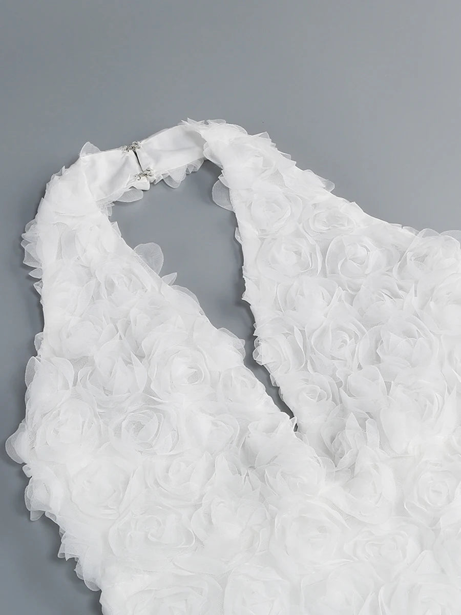 A beautifully crafted long dress designed to feel like modern couture. The halter silhouette frames the shoulders with clean elegance, while the all-over floral appliques create intricate depth and soft dimension. Each petal-like texture catches light gently—like blossoms frozen in a quiet moment of motion—giving the dress a romantic yet sculpted presence. This is the piece I reach for when I want beauty that feels crafted, intentional, and unmistakably feminine.