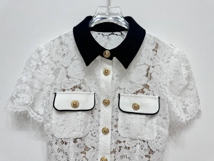 Chic, delicate, and timelessly feminine—the White Lace Formal Short Dress is a beautiful fusion of sweet summer charm and refined detail. Crafted from soft viscose-blend fabric with slight stretch, this embroidered dress features a sophisticated black contrast collar, short puff sleeves, and single-breasted accents that elevate its classic silhouette. The fit-and-flare shape flatters the figure while maintaining breathable comfort, and the subtle hollow-out lace embroidery gives it a graceful texture. Complete with convenient side pockets and an empire waistline, this dress is perfect for garden parties, formal brunches, or day-to-evening styling.