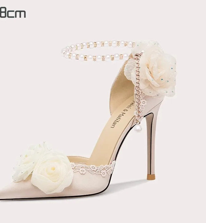 Channel fairy-tale glamour in these white silk stiletto heels, adorned with oversized pink bows at the heel, pearl ankle strands, and sparkling beaded bows on the pointed toe. Handcrafted with couture attention, these super-high thin heels blend artistic details and whimsical luxury for unforgettable events, proms, and weddings.