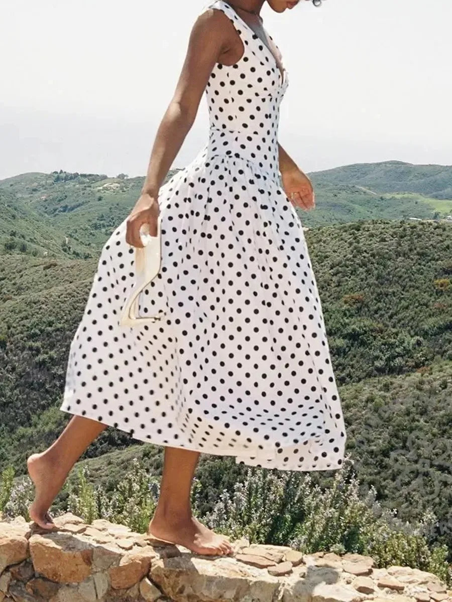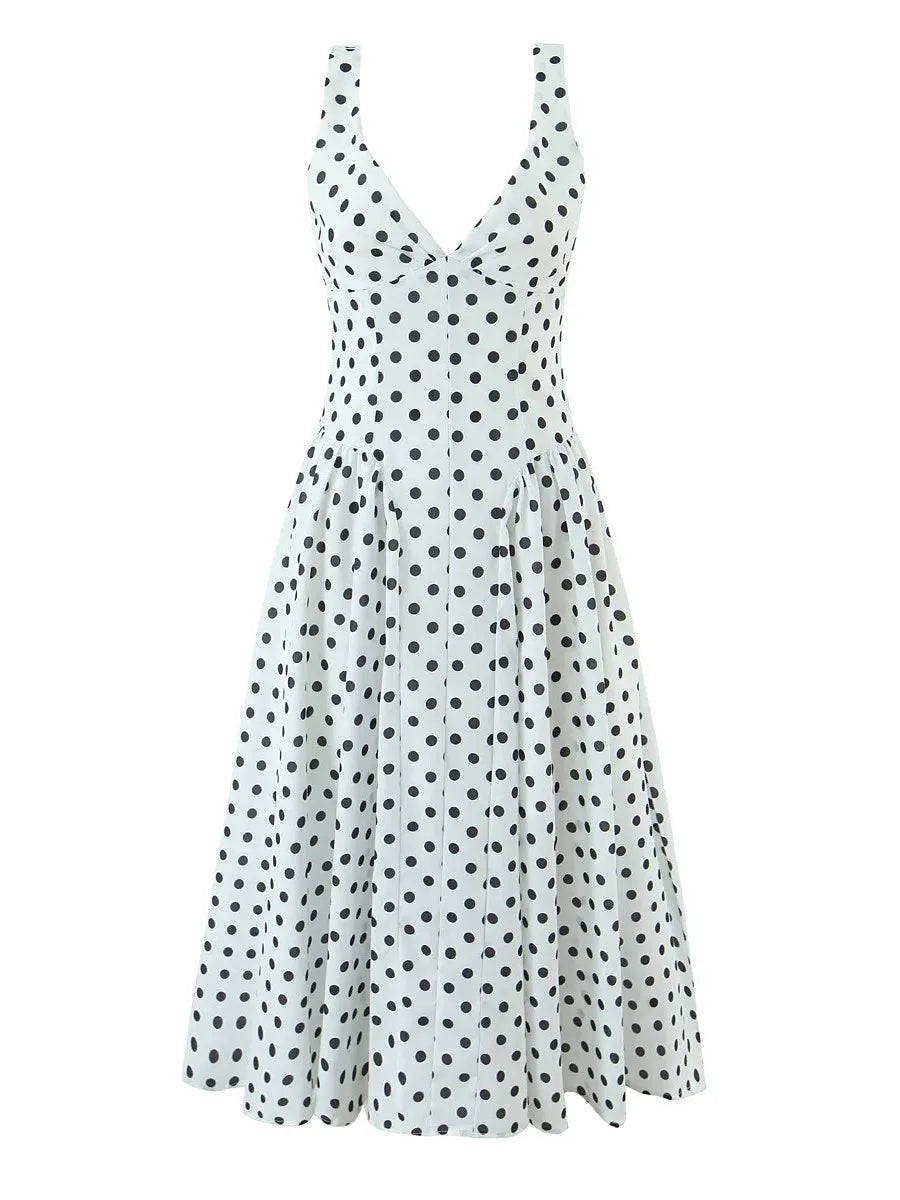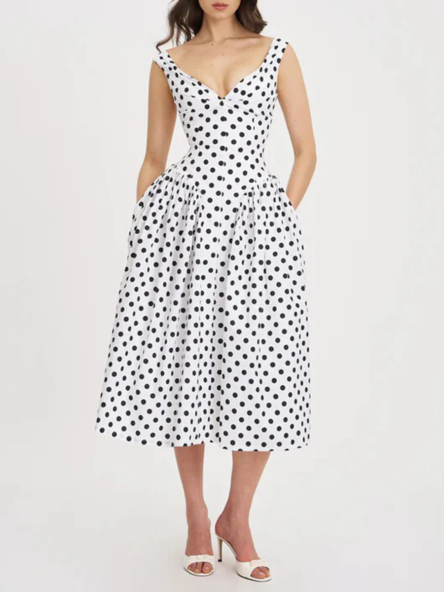 A playful yet polished polka-dot dress that brings vintage charm into a modern silhouette. The V-neck bodice, slim-fit waist, and softly flared A-line skirt create an effortlessly flattering shape designed for breezy days out. If you’ve wondered what dress is perfect for a summer brunch or garden party? — this one feels made for that moment.