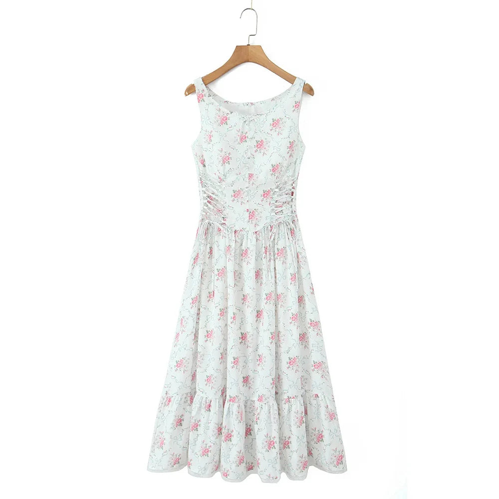 Discover a vibrant blend of style with our White Print Spliced Maxi Dress, designed to offer a slimming and fashionable silhouette. This eye-catching Dress features a unique hit color printing, intricate splicing, and a chic lace-up detail, perfect for making a statement. Imagine yourself exuding confidence at any gathering or enjoying a casually elegant outing. Crafted with slight stretch elasticity and a woven fabric type, this loose-fit Dress offers comfort and a graceful drape. It boasts a classic O-neck, sleeveless design, and an empire waistline. The ankle-length A-line silhouette ensures a figure-flattering profile, making this pullover maxi Dress your ideal choice for a stylish and comfortable ensemble.