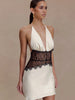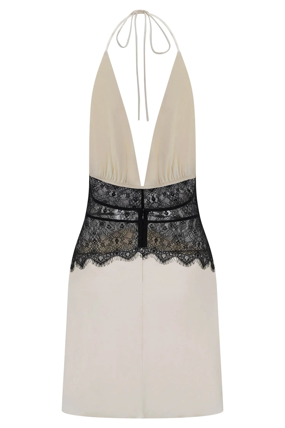 A refined mini dress that blends soft satin texture with intricate lace patchwork for a look that feels both modern and romantic. The deep V-neckline elongates the upper body, while the lace waist adds sculptural contrast and subtle allure. The silhouette moves with quiet confidence—like satin catching a whisper of evening light—making it a standout choice for elevated nights out. This is the piece I reach for when I want something elegant with just the right amount of intrigue.