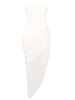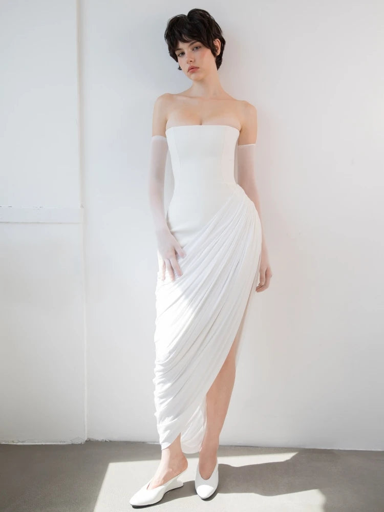 A statuesque strapless maxi dress designed for the moments that deserve a cinematic entrance. The folded draping sweeps across the body with sculptural ease, creating a clean, elongated silhouette that moves like liquid light. This is the piece I reach for when I want a look that feels both minimal and unforgettable — perfect if you’re looking for a white strapless dress that blends elegance with modern confidence.