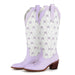 Pair of lavender cowboy boots with white quilted pattern on a white background