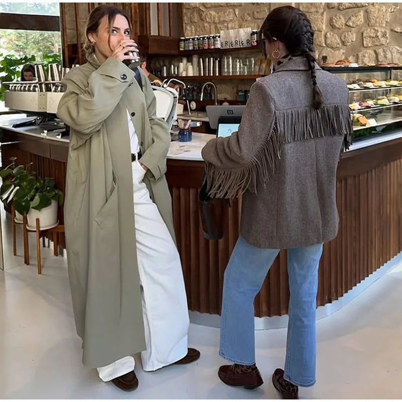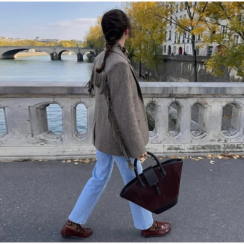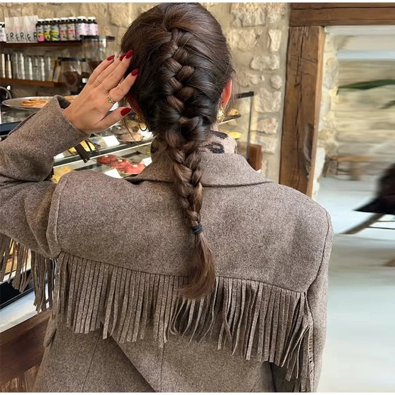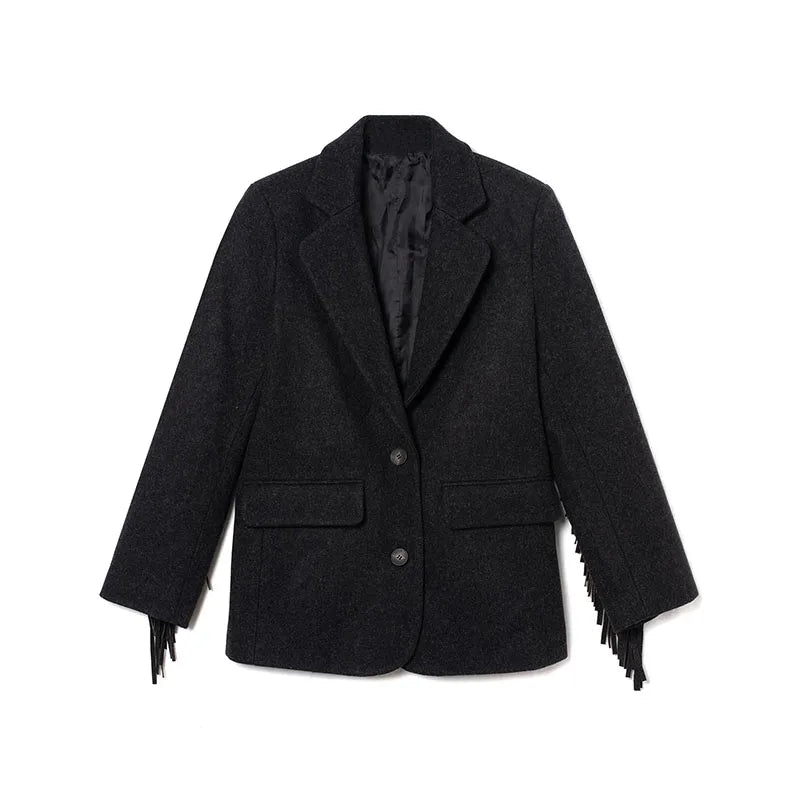 A relaxed wool-blend blazer reimagined with soft, flowing tassels along the sleeves—bringing a subtle western-modern edge to everyday tailoring. This piece blends structure with movement, warmth with ease, and instantly elevates denim, knits, or dresses. The kind of layer you reach for when someone asks, what’s the best wool jacket for a stylish winter look?